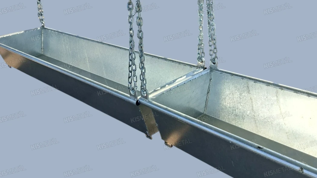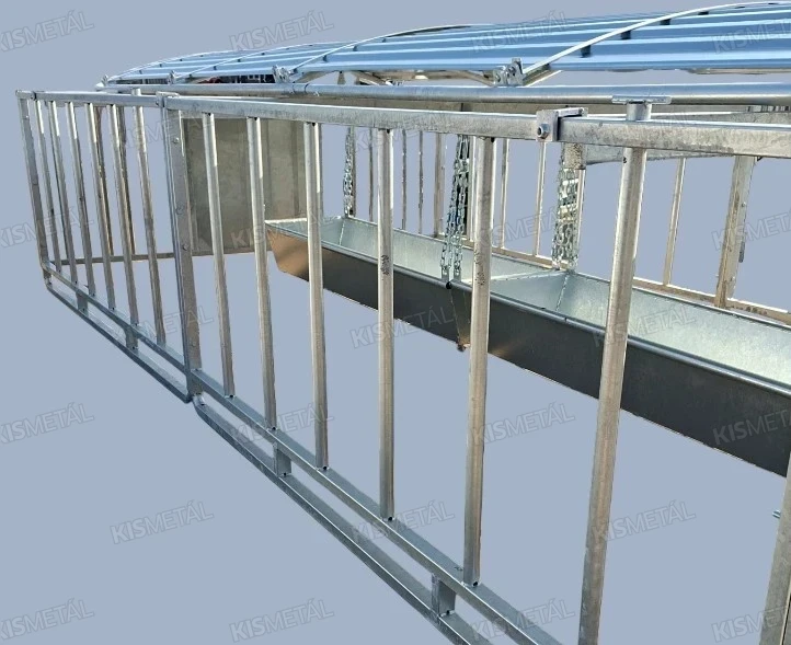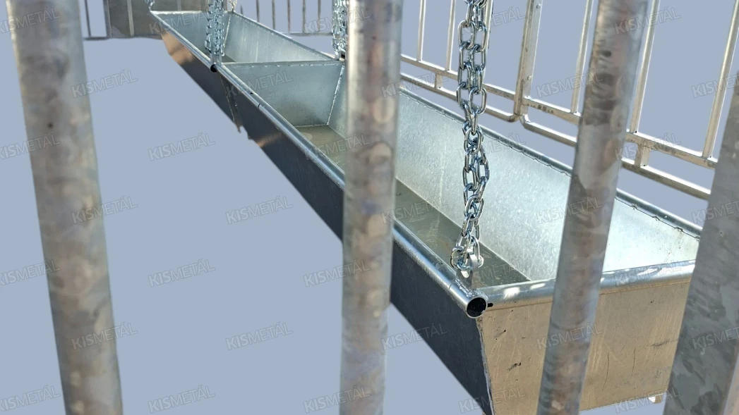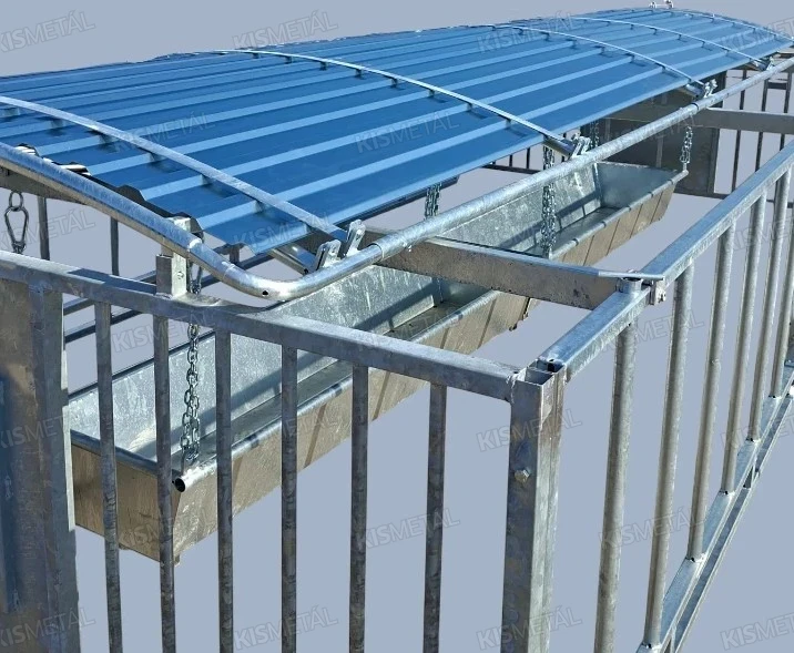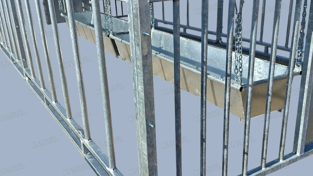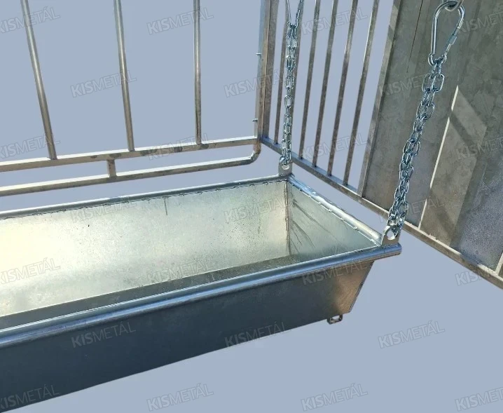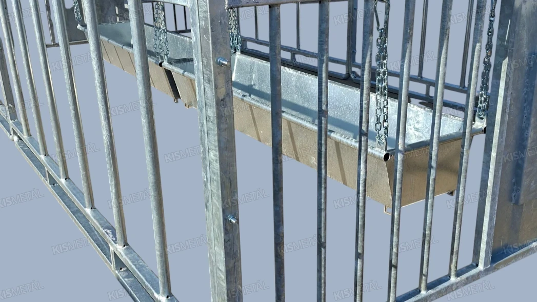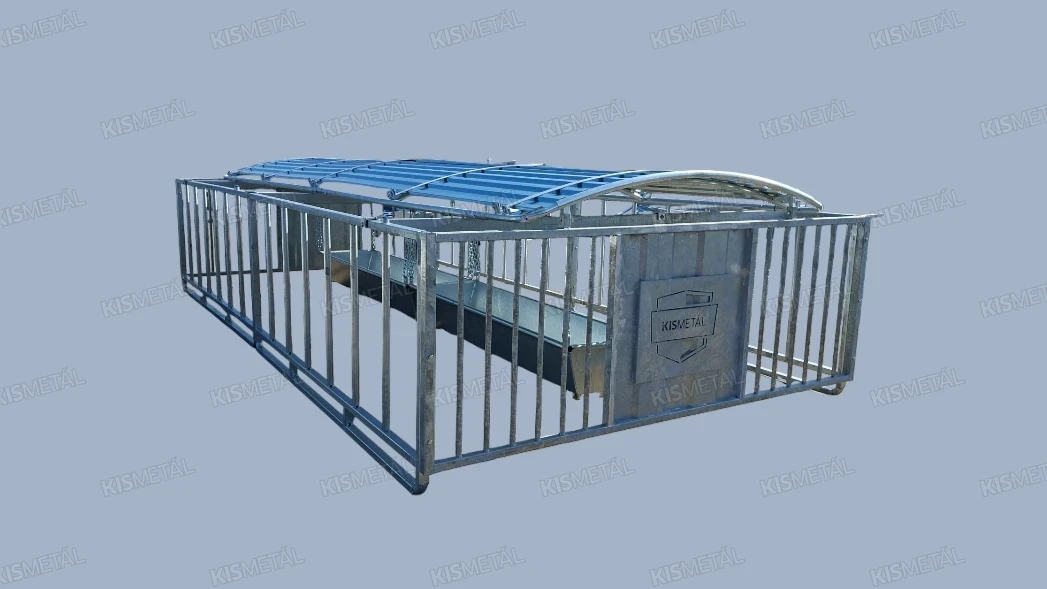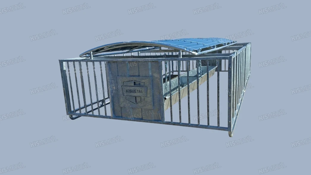Szánkótalpas kivitelű borjúóvoda. A borjak az anyatehéntől elszeparálva tudnak táplálkozni a függesztett etetővályúban lévő takarmányból.